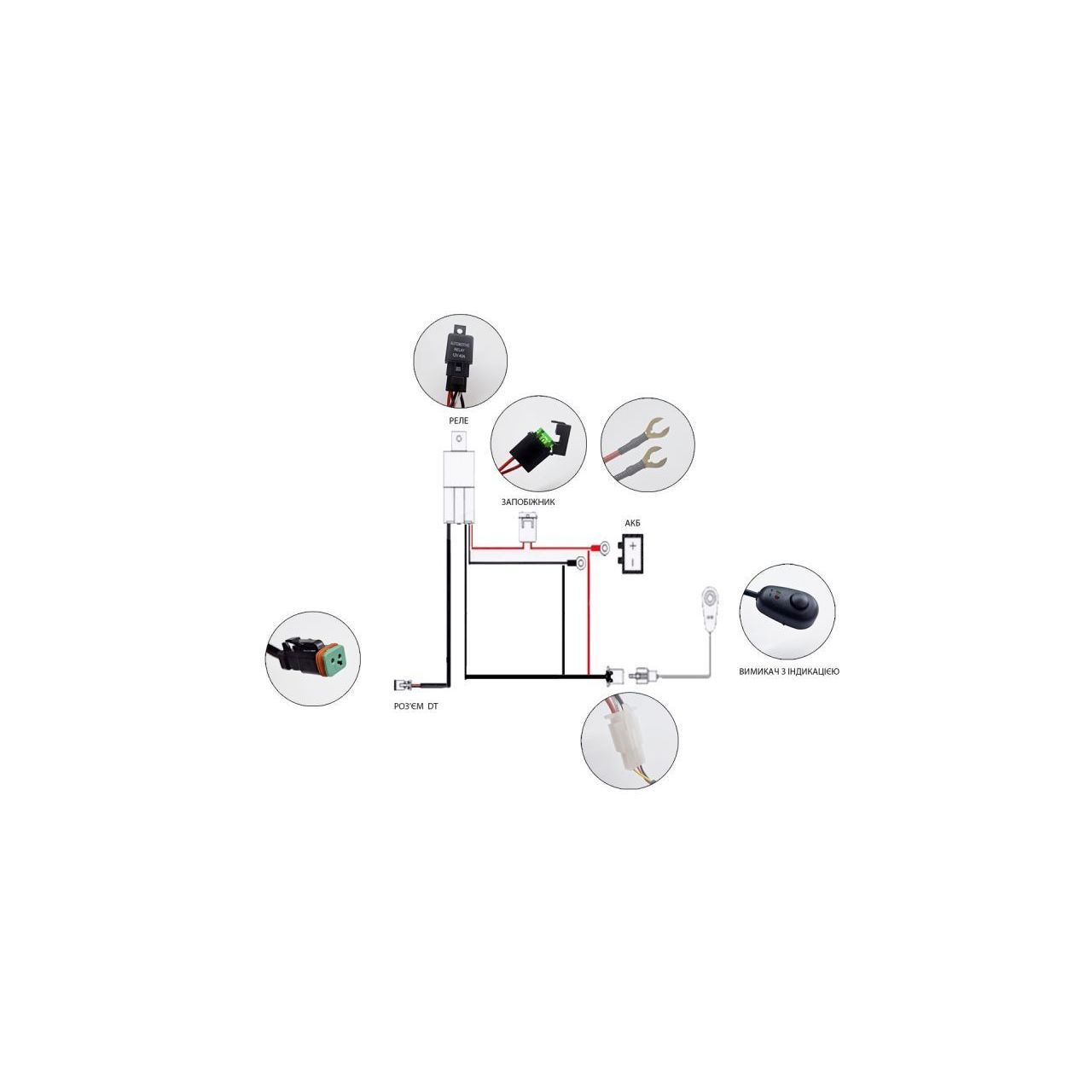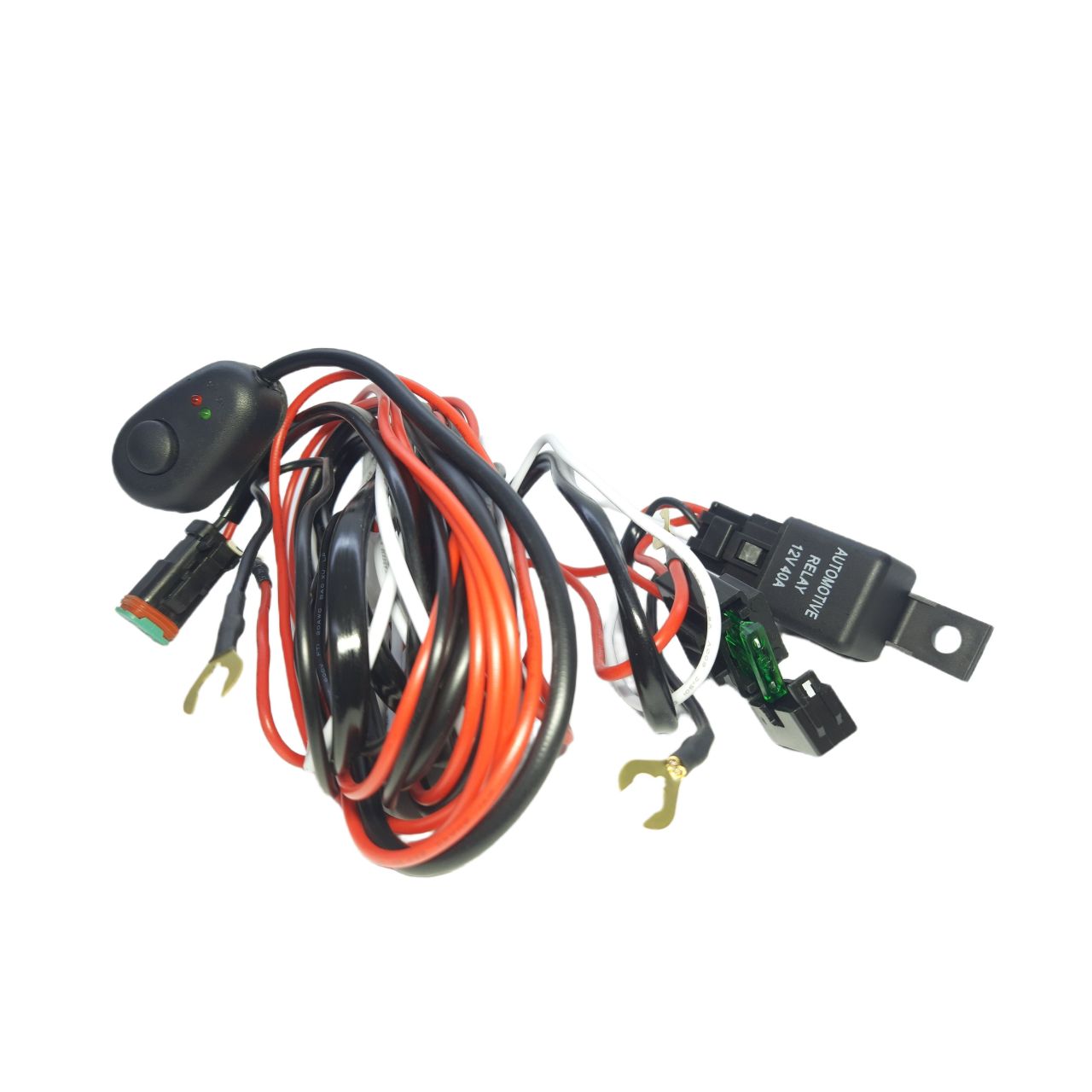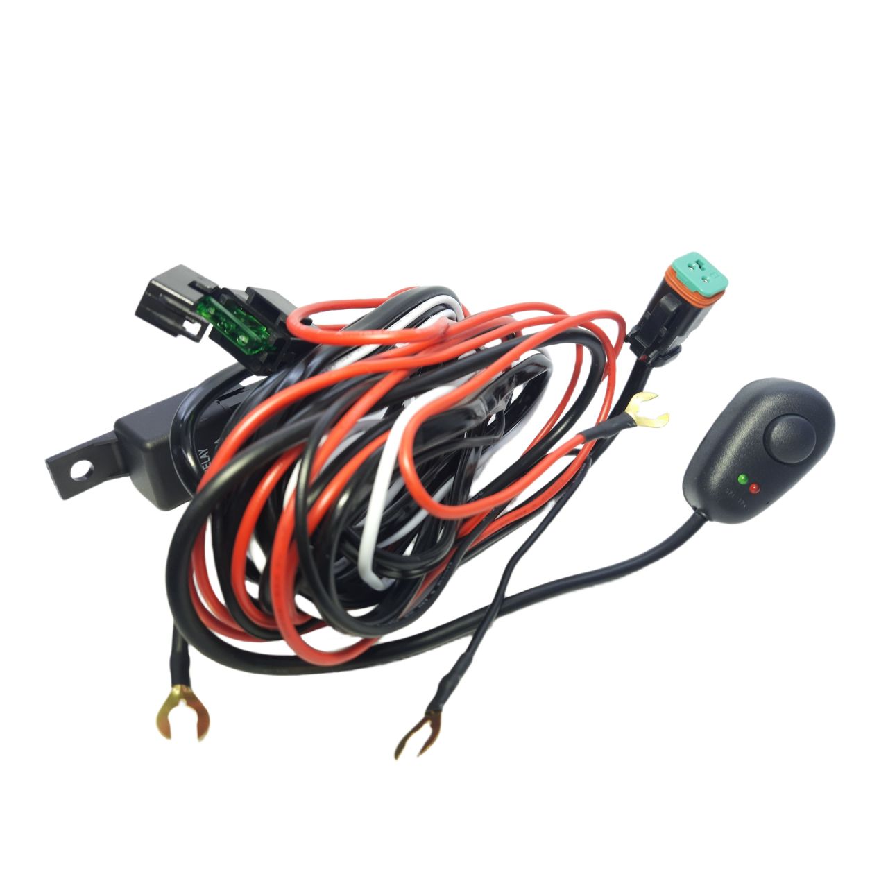 - Универсальная проводка, длина 4,8 м, мощность 120W, кнопка ON-OFF с LED, реле 12V 40A, герметичный разъем DT04-2pin.