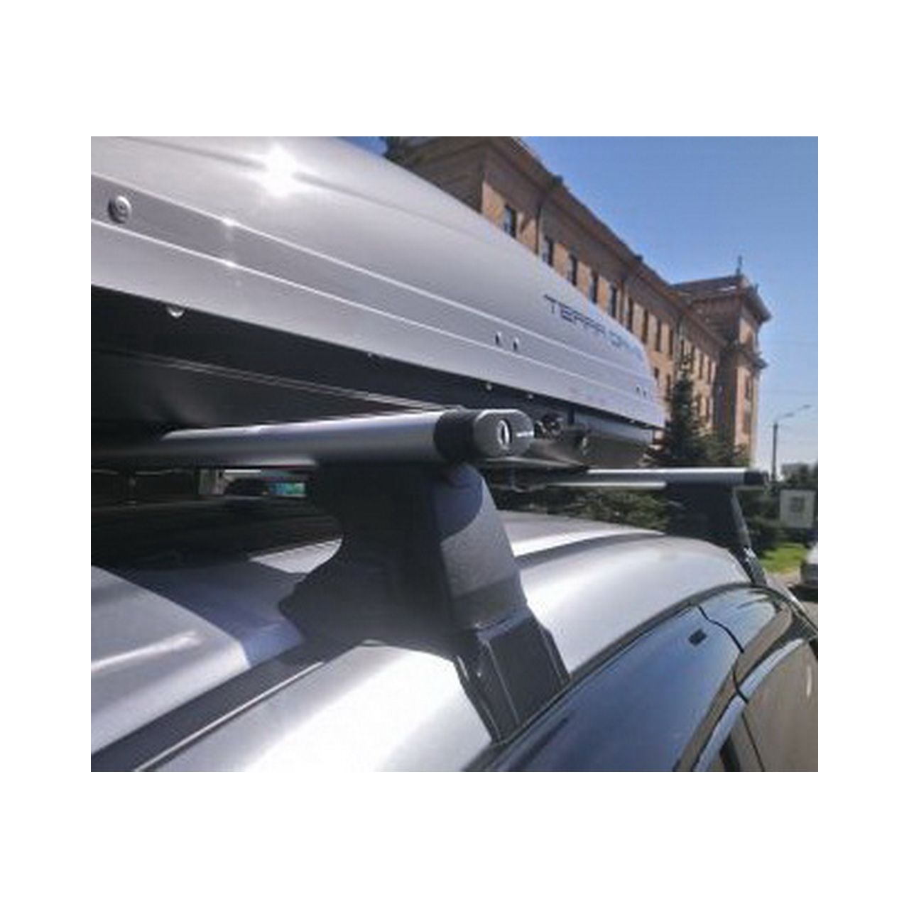 Для крепления бокса на крышу автомобиля необходима багажная система. Размер и конфигурация поперечных планок не имеют значения. Все боксы Terra Drive устанавливаются с помощью универсальной скобы, подходящей под все виды поперечных планок. Скоба охватывает поперечную планку снизу и заходит в бокс, где закрепляется специальными гайками. Монтаж бокса производится в течение 5-7 минут.