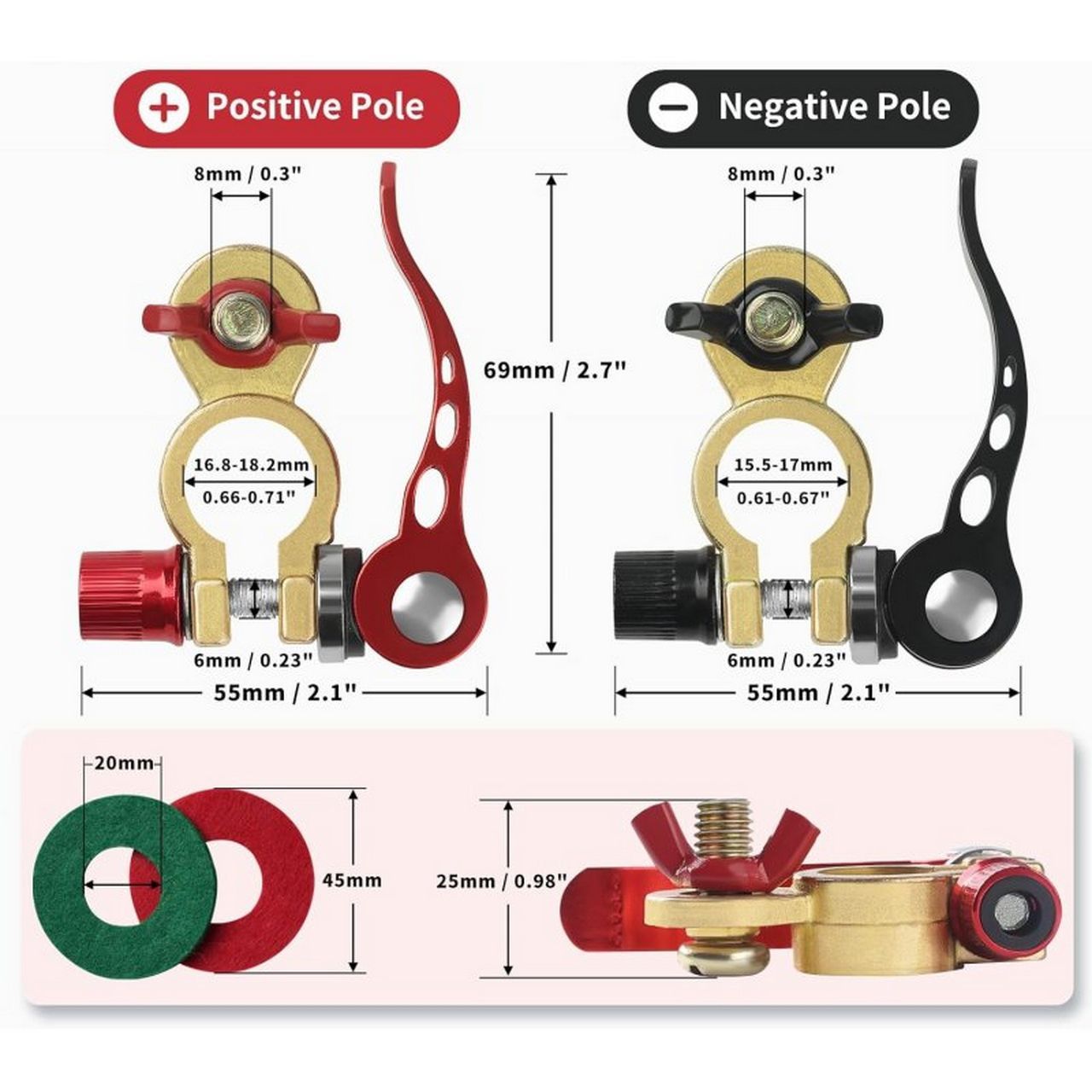 - Установка: монтаж без инструмента, подходит для большинства стандартных выводов АКБ.