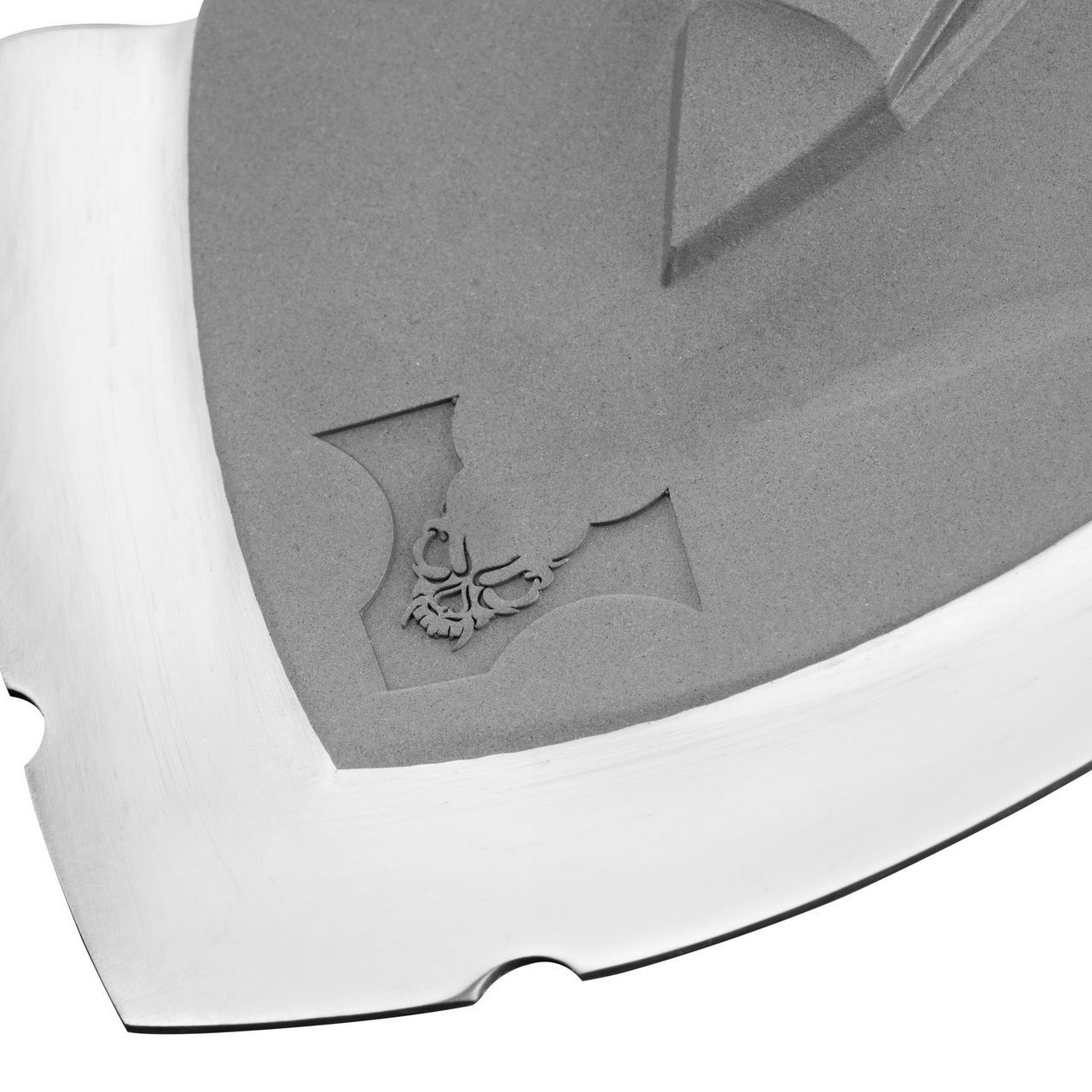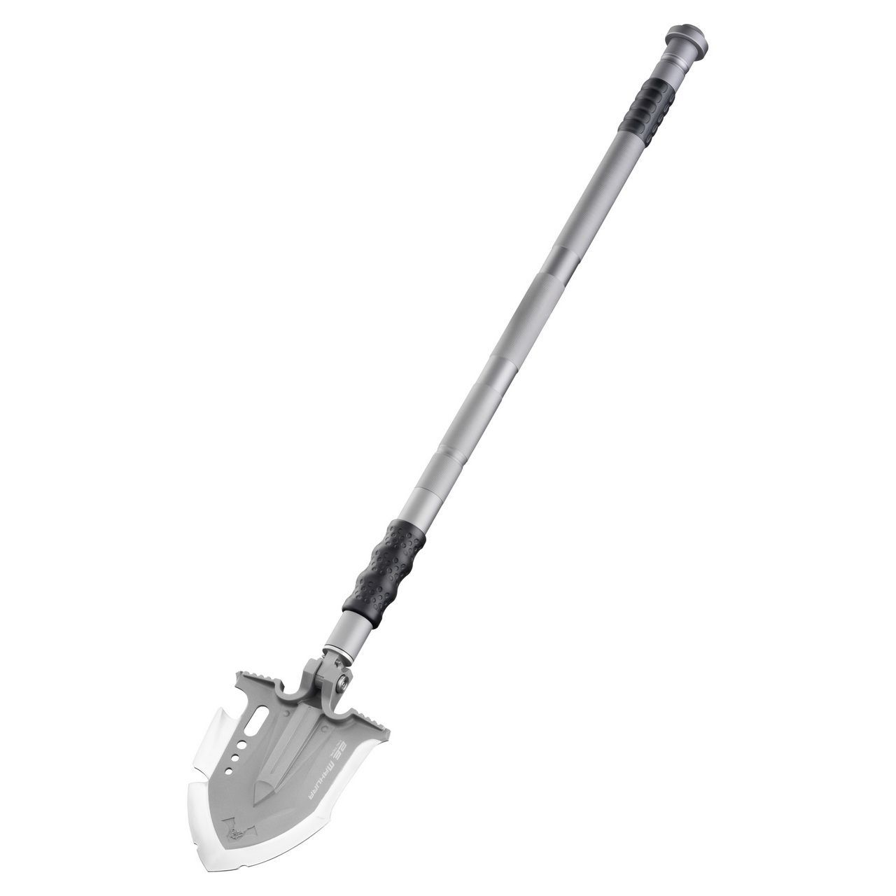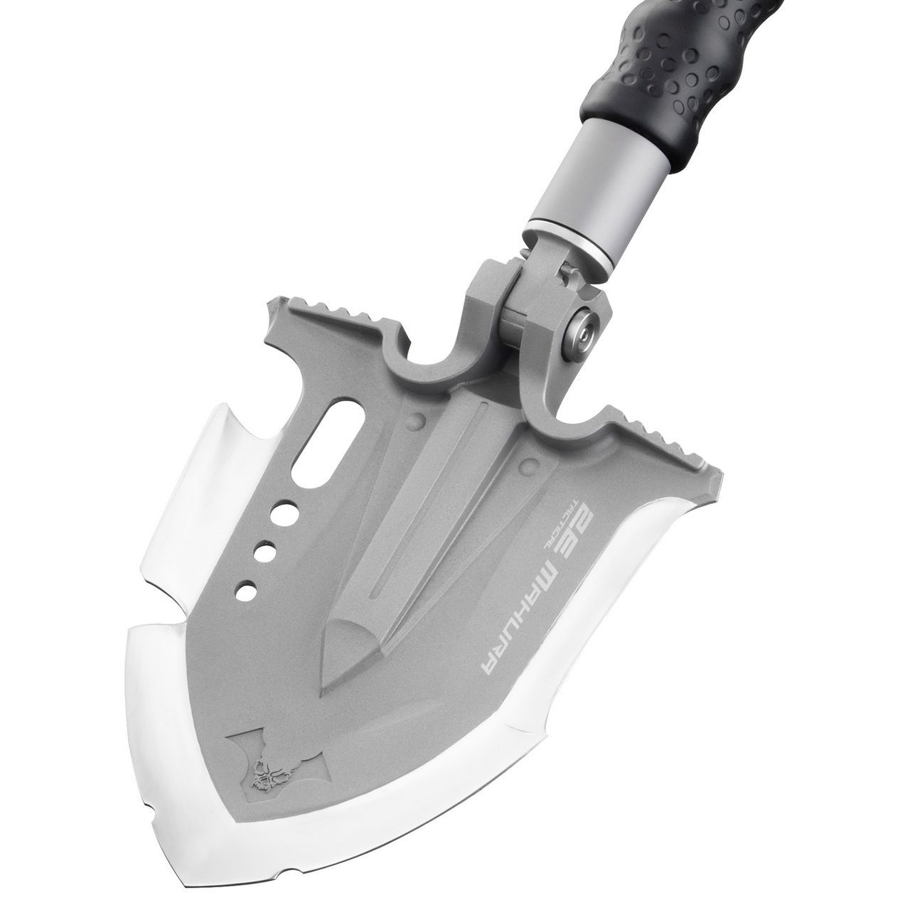 Полотно изготовлено из мартенситной нержавеющей стали с твёрдостью 60 HRC, рукояти — из авиационного алюминия. Фирменный замок даёт 7 фиксированных положений угла (0°–150°), поэтому инструмент удобно использовать для копания, подрезки корней, распила и как молоток.