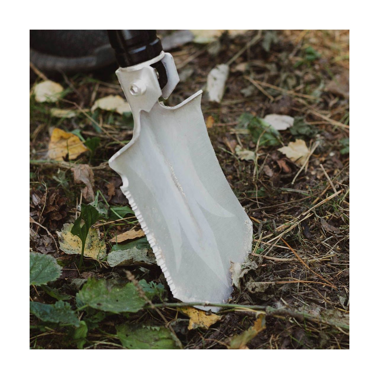 Полотно лопаты Adimanti HK002 выполнено из высокопластичной стали Гадфильда, устойчивой к механическим повреждениям. Этот материал широко применяется в машиностроении и инструментальной промышленности благодаря своей износостойкости, обусловленной высоким содержанием марганца. Полотно обладает оптимальными размерами для выполнения основных задач на природе: длина составляет 12.2 см, ширина — 16.5 см, а толщина стального полотна — 5 мм.