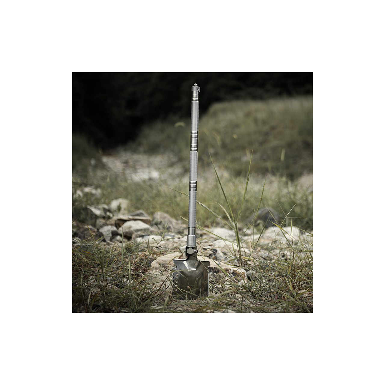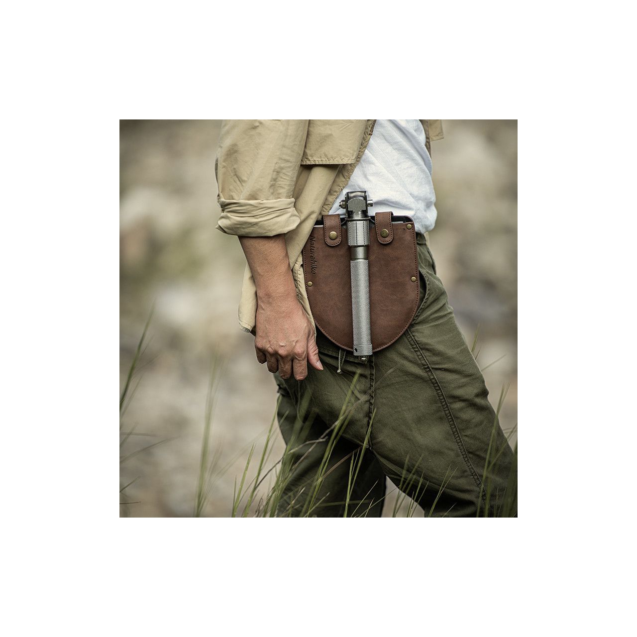 Конструкция изделия сочетает в себе несколько инструментов: пила, открывалка для бутылок, ножевое лезвие. Шестигранный ключ может быть ослаблен или затянут, а внешние шестигранные гайки имеют размеры 6, 8, 10, 12 миллиметров. Встроенный нож обладает несколькими функциями, а также имеется встроенный стержень для разжигания огня. В хвостовой части модели расположен молоток из углеродистой стали. Ослабьте резьбу на ручке и поверните головку лопаты, чтобы превратить её в кирку. Угол поворота головки лопаты составляет 180 градусов.
