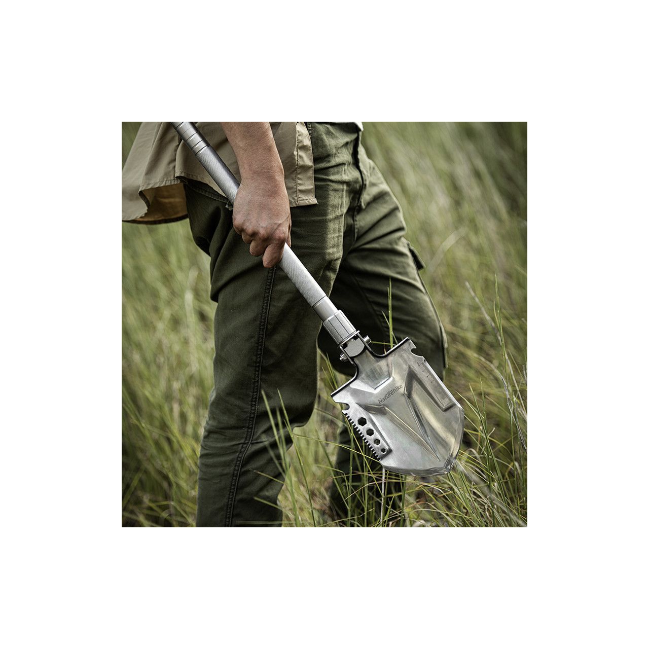 Это изделие представляет собой отличное режущее и рубящее средство. Ручка изготовлена из прочного алюминиевого сплава. Основные характеристики этой лопаты включают многофункциональность, портативный дизайн, разборные компоненты и возможность поворота на 180 градусов.