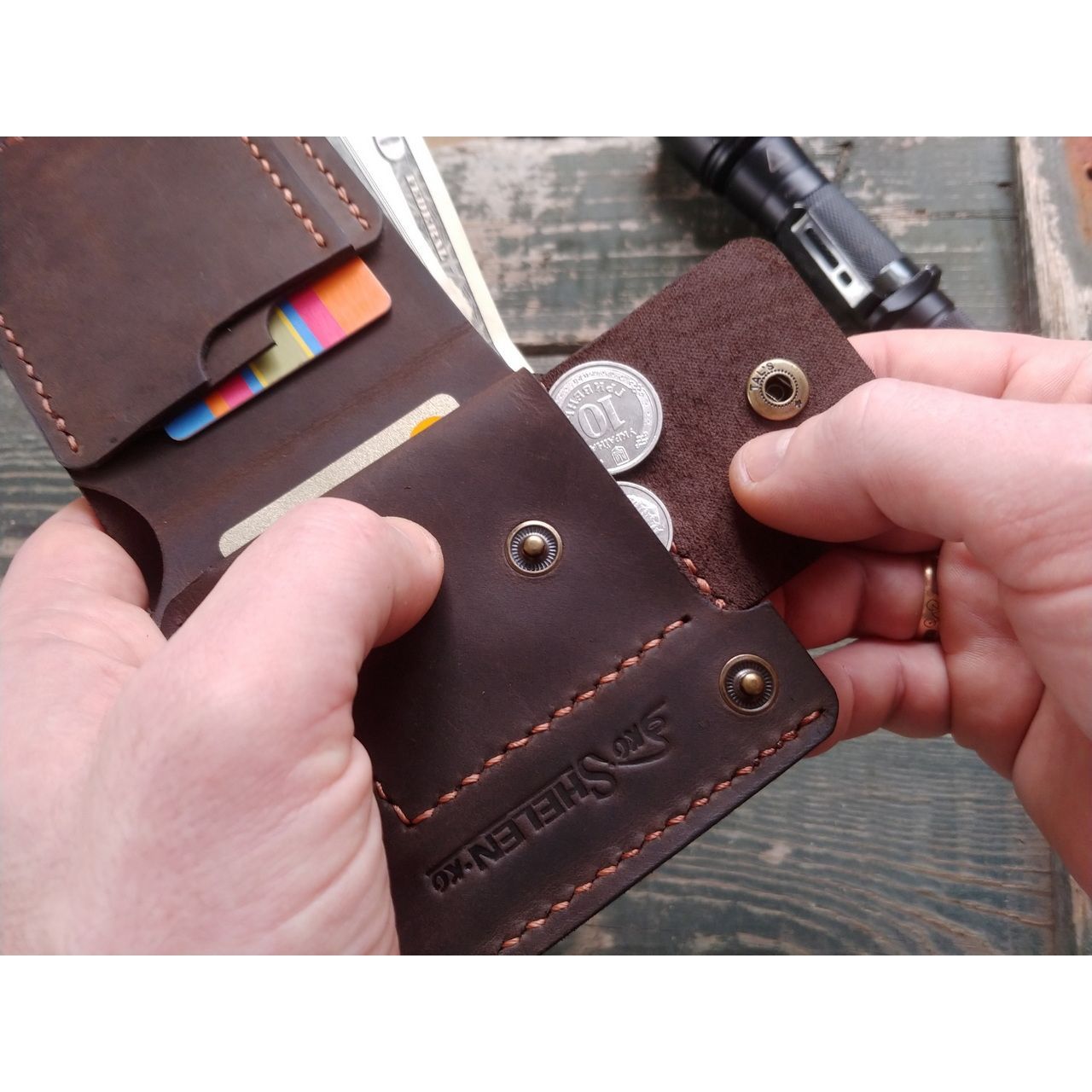 Кожен гаманець Shebro виготовляється вручну з натуральної шкіри типу Crazy Horse товщиною 1.4–1.6 мм. Цей матеріал відомий своєю міцністю та ефектною патиною, що з часом робить виріб ще красивішим. Компактна форма забезпечує комфортне носіння, а продумана конструкція — зручний доступ до купюр і карток.