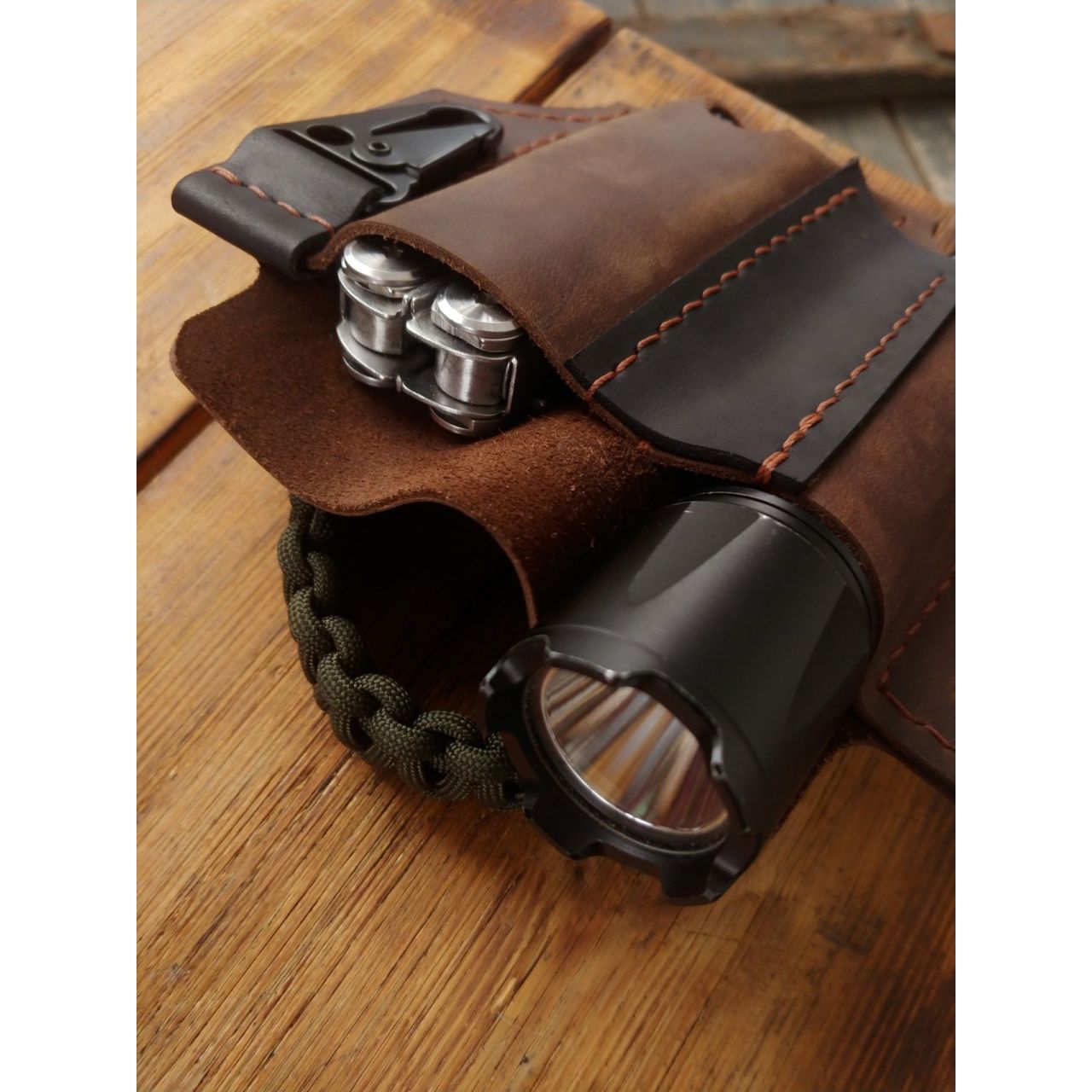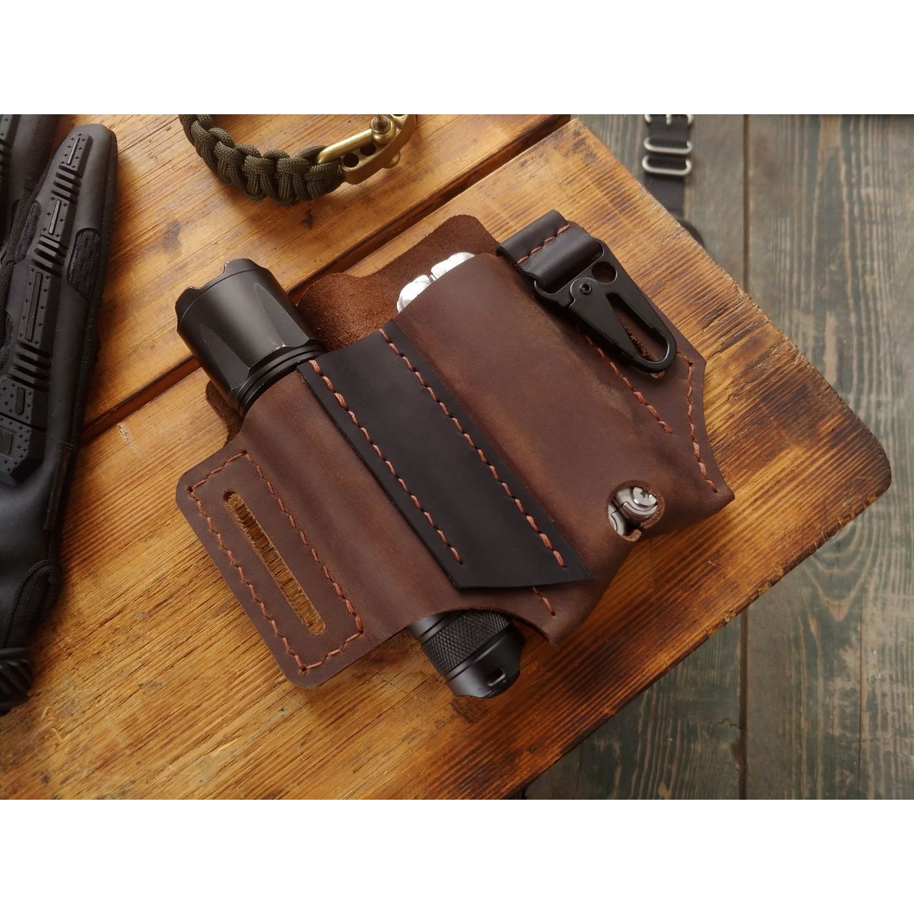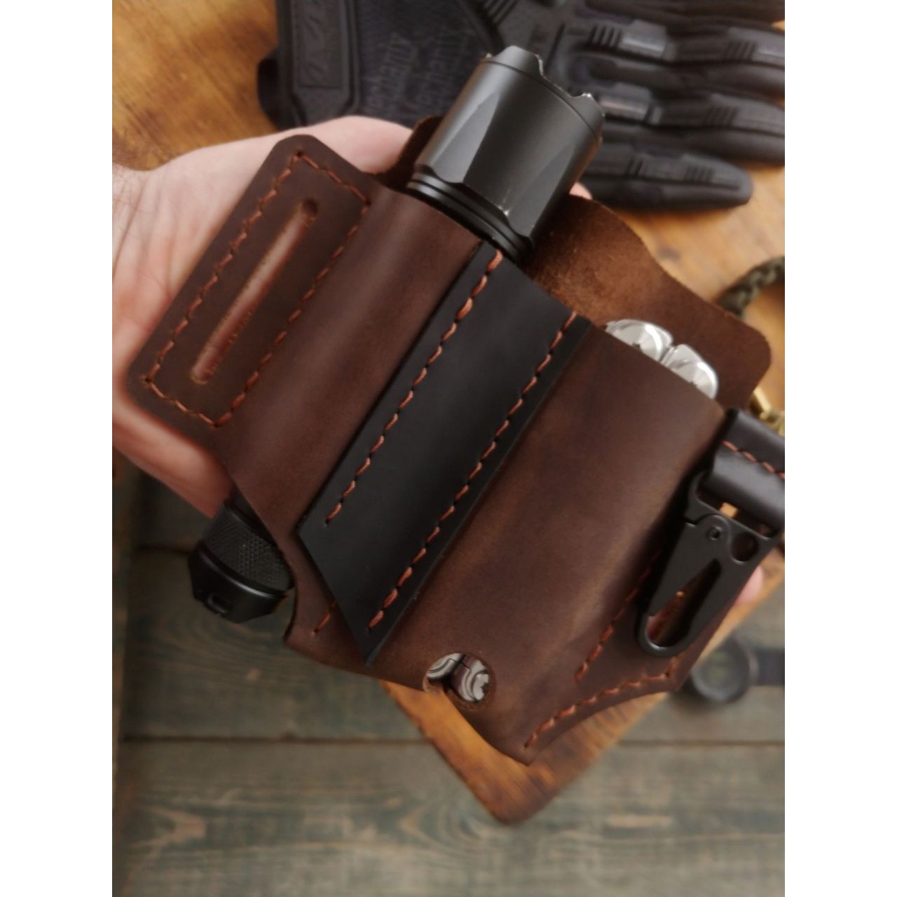 - Шкіра крейзі хорс, ручна робота, відділення для мультитула і ліхтарика, доступний у чорному і коричневому кольорі.