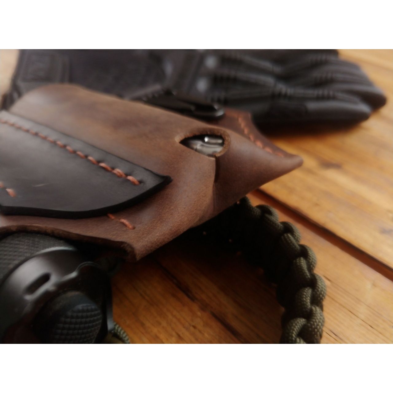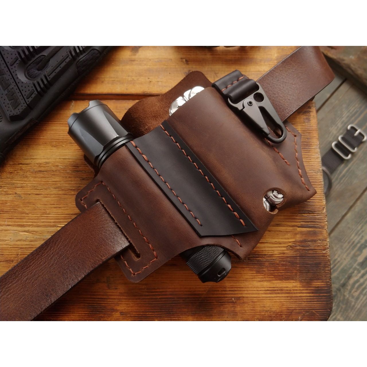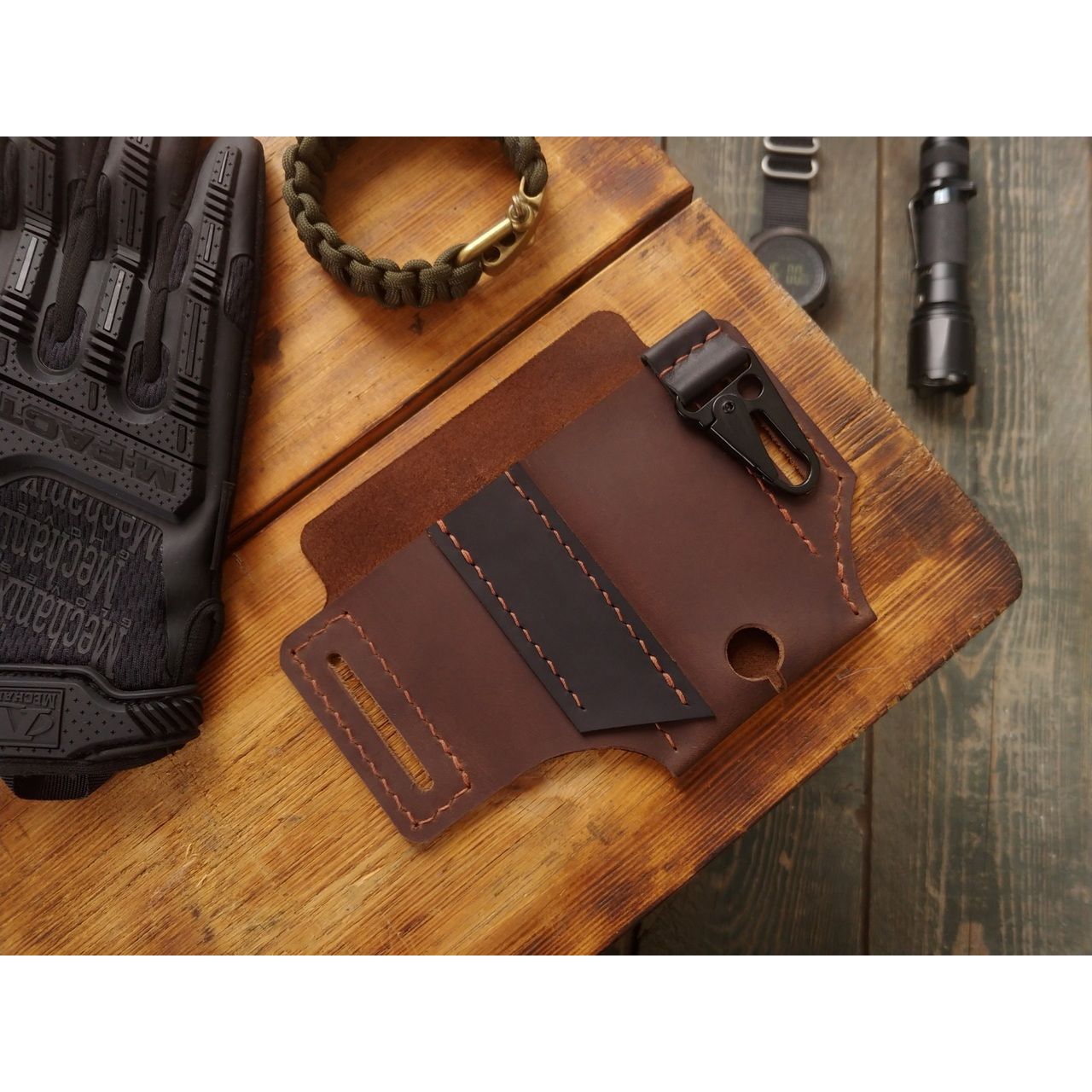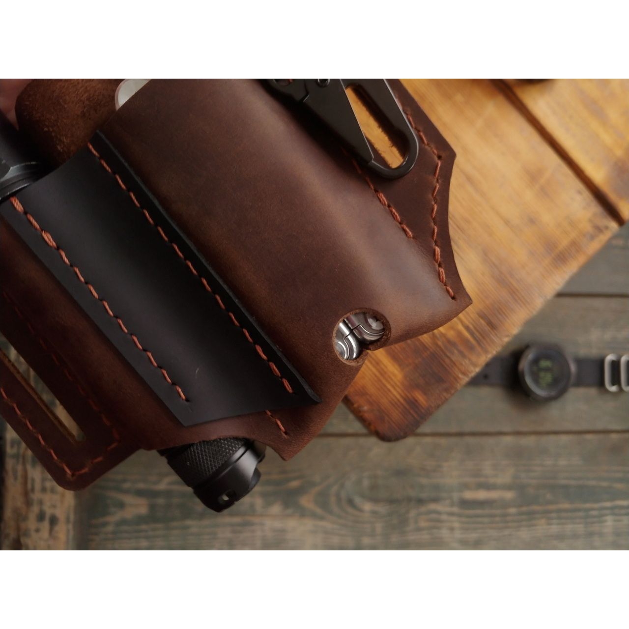 - Шкіра крейзі хорс, ручна робота, відділення для мультитула і ліхтарика, доступний у чорному і коричневому кольорі.